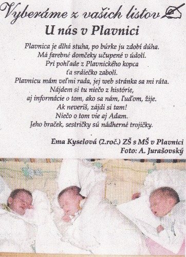 V Ľubovnianskych novinách číslo 22 zo dňa 03. 06. 2008 bola uverejnená báseň od Emky Kyselovej s názvom U nás v Plavnici. Posúďte sami básnickú šikovnosť tohto dievčatka. :-)