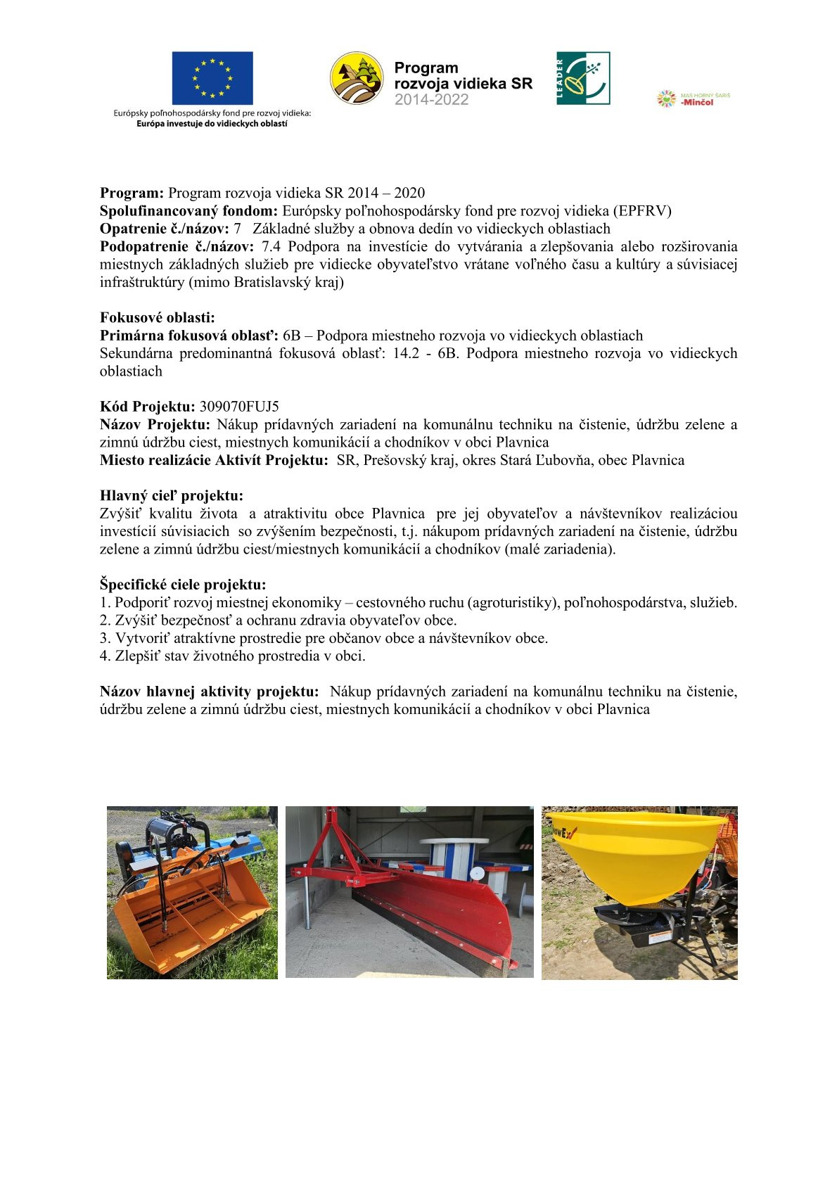 Názov hlavnej aktivity projektu: Nákup prídavných zariadení na komunálnu techniku na čistenie, údržbu zelene a zimnú údržbu ciest, miestnych komunikácií a chodníkov v obci Plavnica